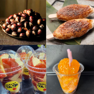 信州産りんご飴 700円、みかん飴 500円、五平餅 500円、焼き栗 600円、栗アイス 350円、ソフトドリンク 350円