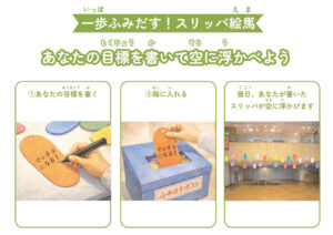 新たな一歩をふみだす ために、スリッパ絵馬(えま)に目標を書いて、ロビーに展示してみませんか?